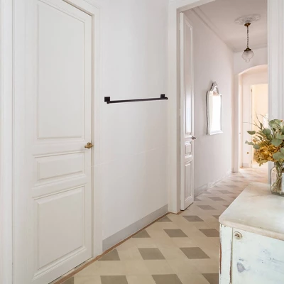 The Design House Karsen Towel Bar is a contemporary addition to any bathroom. This modern towel bar is constructed with zinc and aluminum, finished in oil rubbed bronze and measures 24-inches long. This bar has squared edges and a sturdy design for hanging medium to larger sized towels. You can hang this rack above a toilet, on a door, in a closet or along a wall. A standard mount and concealed screws are included for easy installation. Using the provided installation template, installation is quick and straight forward. The Karsen Collection features a matching towel ring, toilet paper holder and robe hook, as well as a variety of light fixtures for a complete bathroom set to enjoy for years to come. This product comes with a 1-year limited warranty