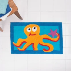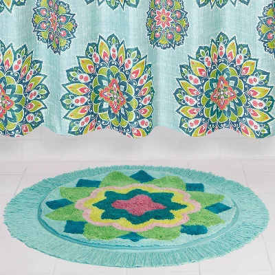- Update and refresh your bathroom with this round tufted rug that features an oversized floral medallion in shades of blue, teal, yellow, green and coral blush against an aqua background