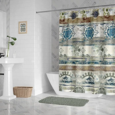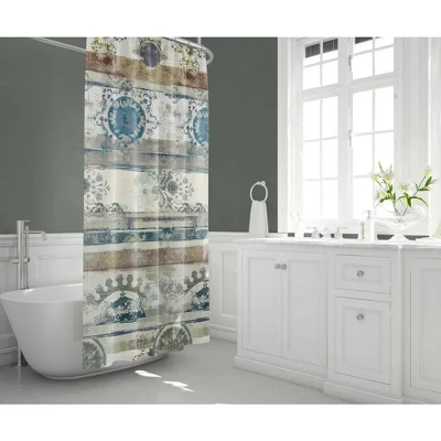 This bohemian patterned shower curtain, “Antique Boho,” is the perfect decor to add charm and beauty to a room. The distressed design features painted patterned of damask like elements and stripes in calming blue and brown hues. Bring home this elegant shower curtain to liven up your bathroom!