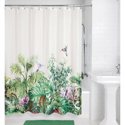 Take a refreshing shower or bath in your personal tropical paradise with the Palm Valley Shower Curtain by Allure Home Creation. This beautiful design features intricately detailed tropical leaves, florals and two delightful hummingbirds in soothing shades of nature on an off white background. You’ll never want to leave your island retreat. This oversized design is printed on 100% easy care textured polyester. Not only will this shower curtain bring fashion to your bathroom, it will help prevent water from splashing outside of your tub or shower stall. The reinforced button-hole top on this fabric shower curtain works with standard shower hooks and curtain rods. Use of a liner is recommended. Machine wash and tumble dry on low heat.