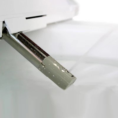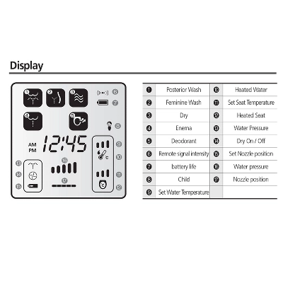 With the large wireless remote control with magnetic mount, choose among the various wash modes, one of which is Spiral stream which may relieve constipation. You can also use the Simple Operation Panel right by your side for the frequently used functions. The LED light behind the panel lights up in the dark. The 3-in-1 stainless steel nozzle self cleans before and after each wash and it flushes out any impurities after each wash. The nozzle cap is also removable for an easy clean or to switch for another user. The nozzle self flushes out all impurities through the drain slit on the nozzle’s underside. The lid covers the seat when closed to conserve the heat from the seat. Wide water stream and bubble infusion wash. Will not fit on most French curves. Made in Korea.