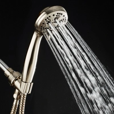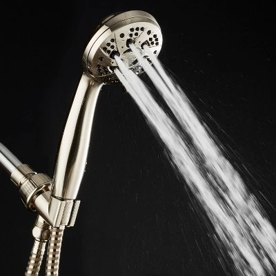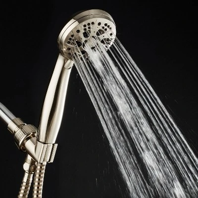 The AquaDance High-Pressure 6-Setting Handheld Shower Head comes with an Extra-Long 6 Foot Hose & Bracket and a premium Brushed Nickel finish. The showerhead can be used as an overhead or handheld shower with a large 3.5-inch face, high-power click lever dial, and ergonomic grip handle. The rub-clean jets help with easy cleaning to prevent lime buildup. The 6 flow settings include Rain, Massage, Mist, Pause, and two mixed modes. Comes complete with all washers, plumber’s tape, and easy-to-follow instructions. Easy to install without the use of tools in under minutes to any standard shower arm. The angle-adjustable overhead bracket is flexible and convenient to position where you want it to go for hands-free use. Extra-long 6-foot reinforced hose that features a durable heavy-duty design with brass connection nuts.